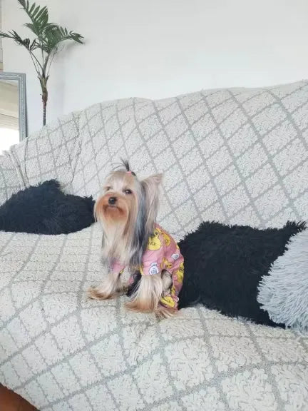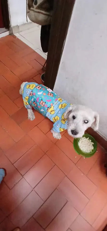 "OMG, love these pet onesies!😍 My little furball just looks adorable in them. They're super comfy and the fit is perfect. The fabric is very breathable, so my pet stays cool even when it's warm outside. Definitely buying more as gifts!🐾❤️"